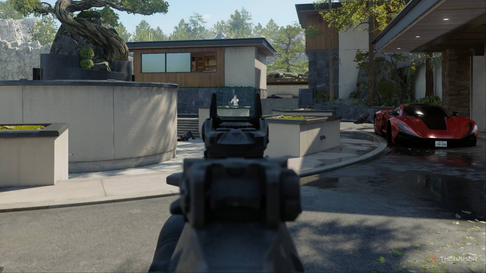Aiming at a target with the M15 Mod 0 on the Raid map in Call of Duty: Black Ops 7.