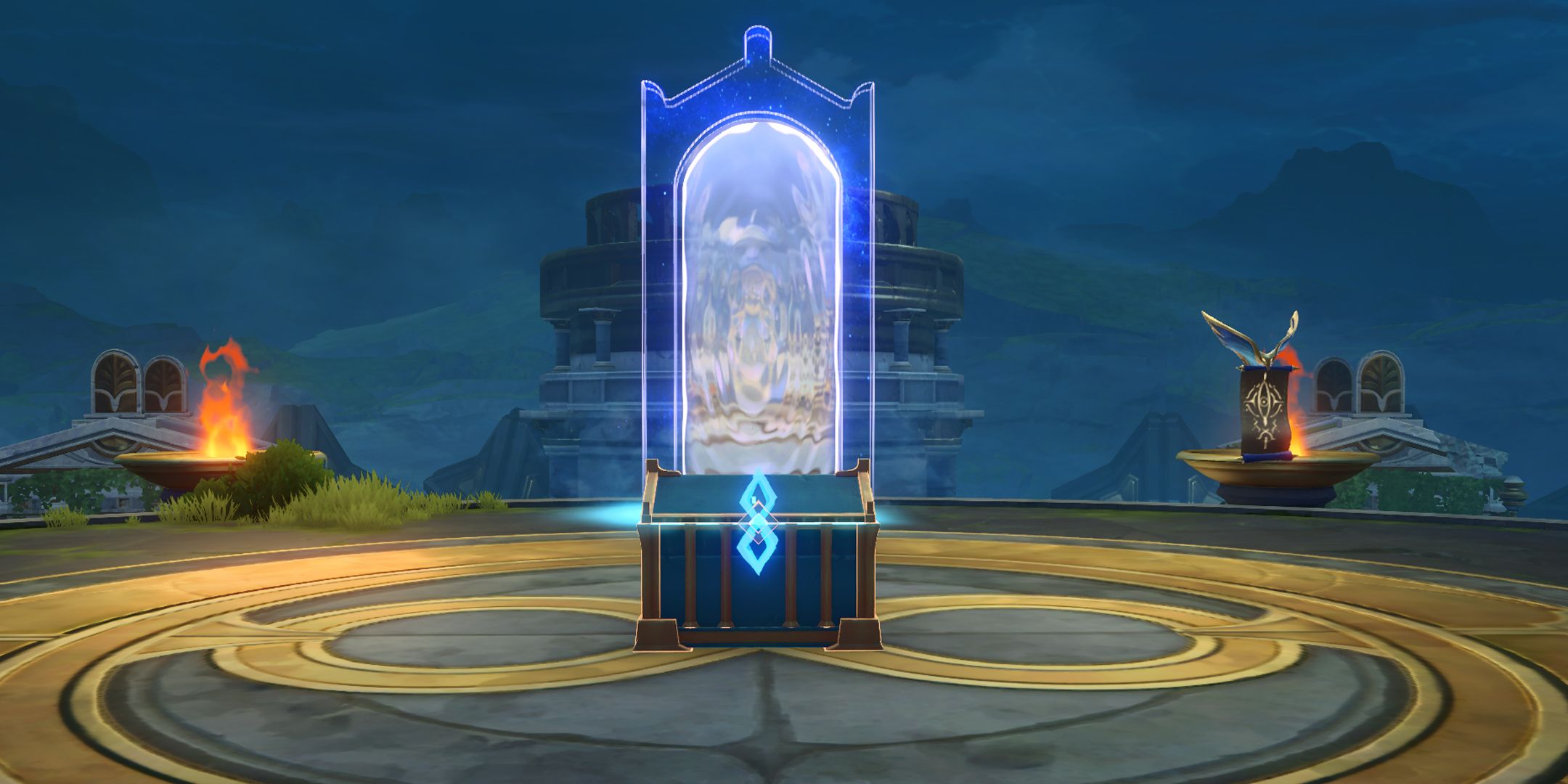 12. Gå ner för trappan och, när du når mitten av arenan, byt till gångläge och gå i cirklar ovanpå gul cirkel på marken. Efter några omgångar kommer en nymf att spawna vid kanten av arenan och ställa en fråga till dig. Svara “Tretton lågor” och en dyrbar kista kommer att dyka upp för dig att samla in.