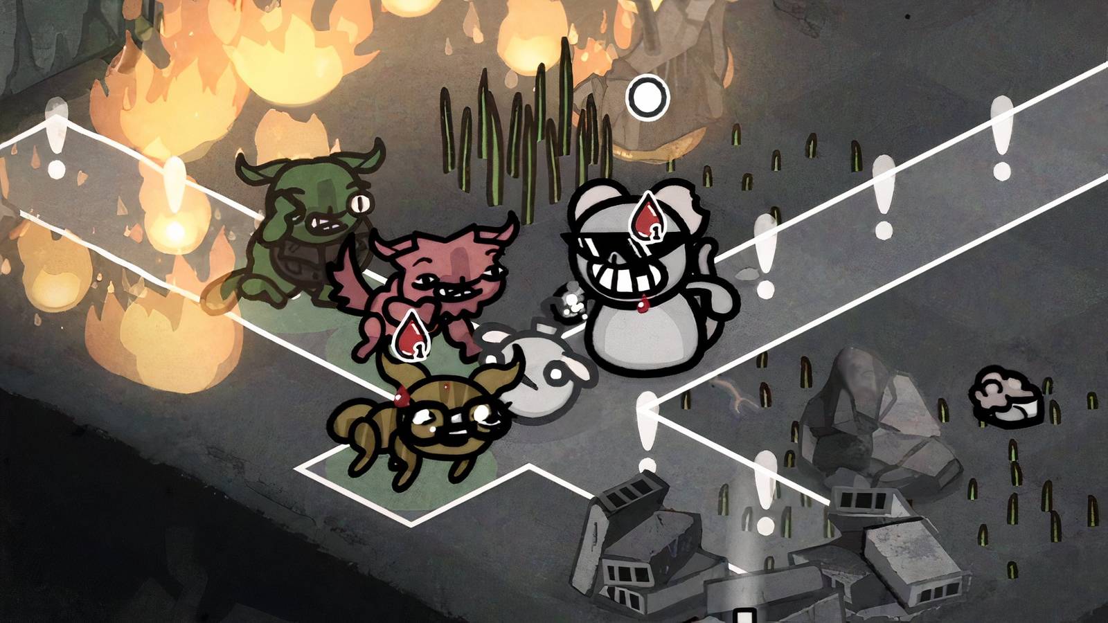 These explosives are shaped like rat heads and target not only the tile they land on, but also 10 tiles horizontally and vertically (the gray exclamation point above them indicates the danger areas). Thankfully, they don't explode right away. Instead, they go off after your next hunting cat finishes its turnright after the boss attacks. All the tiles they hit burn, and stepping on them burns your cat.