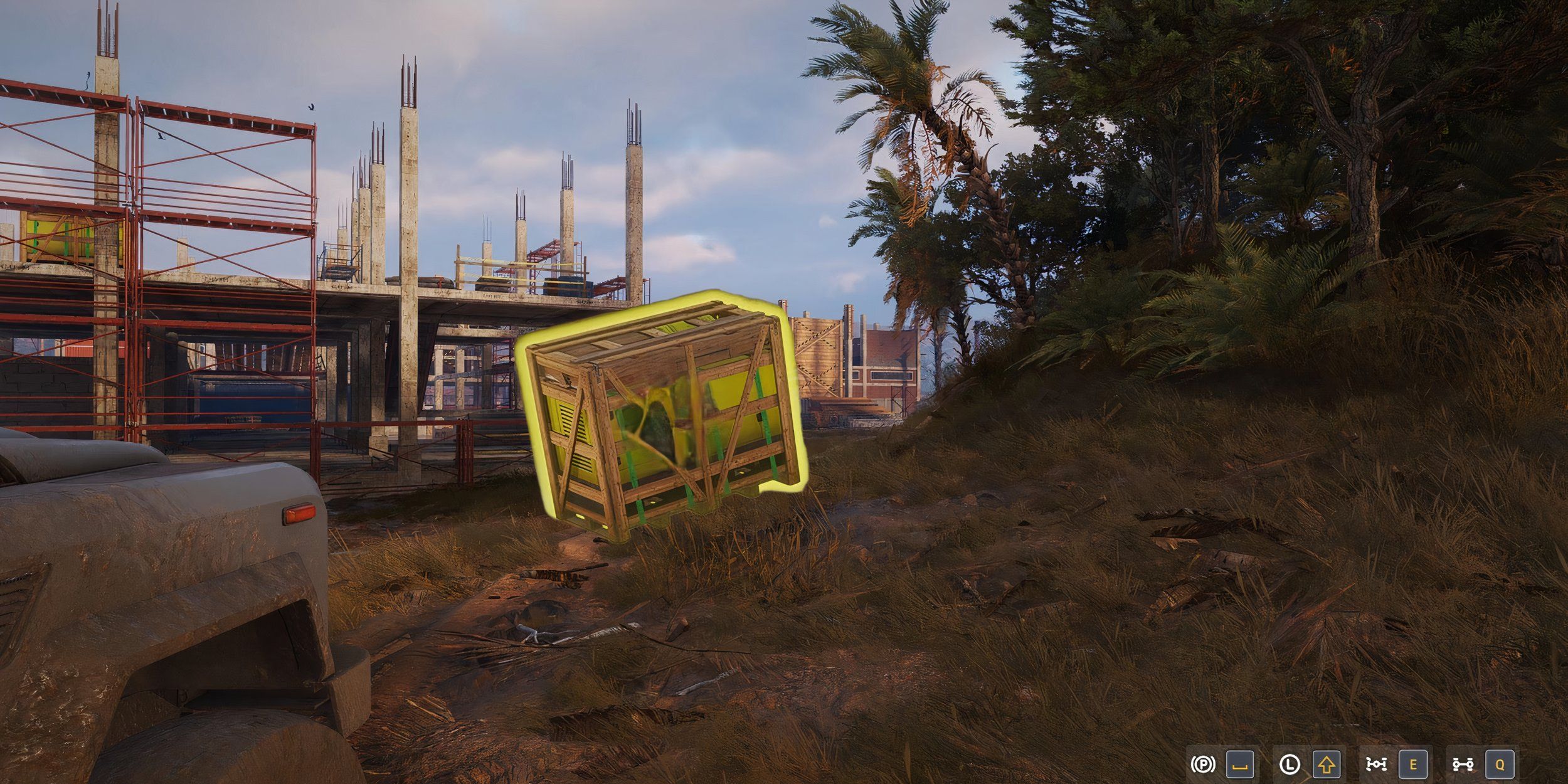 Outside the building, use your scanner to determine the container on the top floor. Start from the wall directly west of the container, run down the dirt track until you see a ramp. In front of that you see one Wooden card marked with yellow and black tape. Drive through it to enter the building.