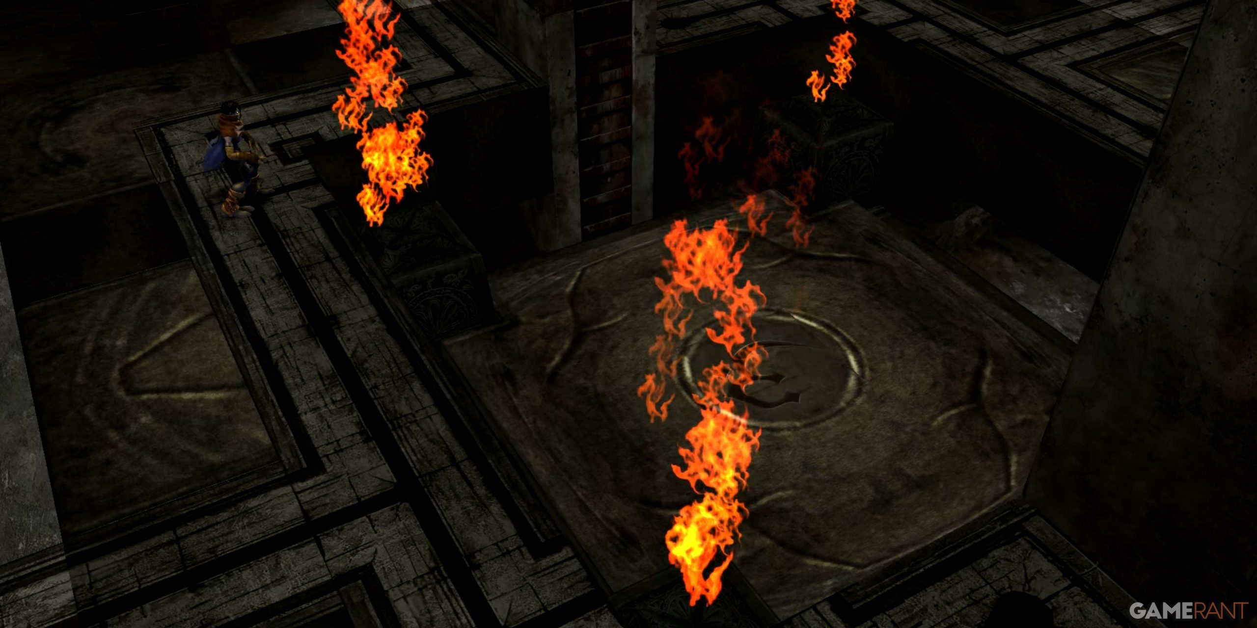 Go back to the elevator and take it back to the top. Pull the lever opposite the elevator to lower the central platform. Jump down and go to the northwest corner. Look along the west wall and you'll find a tunnel that you can use to move down. Follow this tunnel to the other side to find a room with 4 blocks under lit fires. Each of these blocks can be pushed to a point where they will burn and destroy the wooden beams that hold up the central platform. After a short cutscene about the wood burning has finished playing, move on to the next block until the platform crashes.