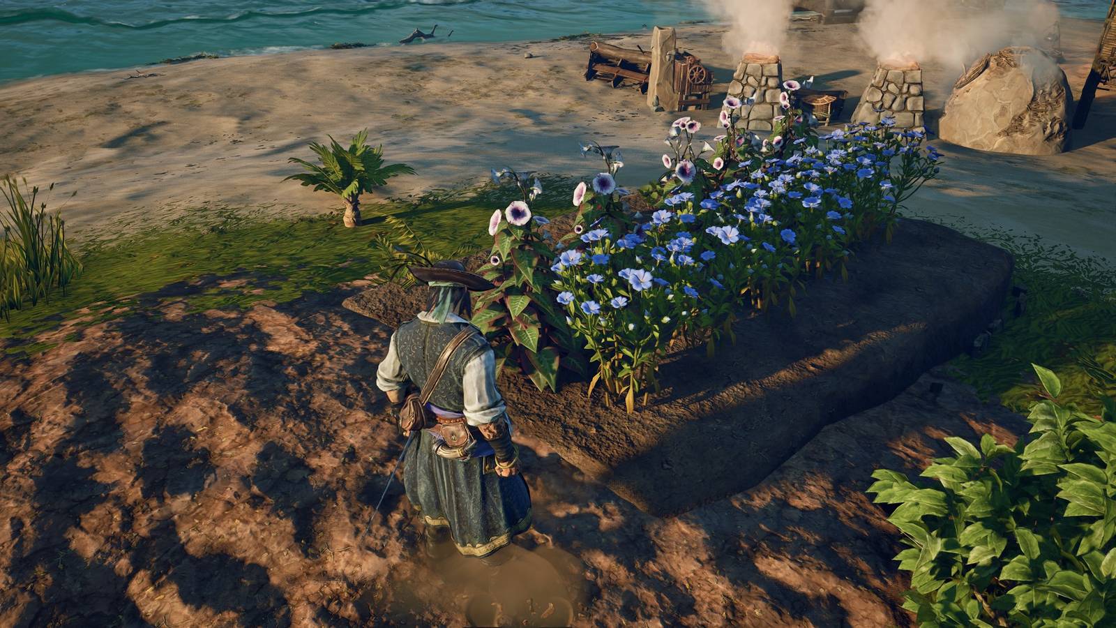 Now, when you get to a Foothills Island, set up a small beach camp with a tent, a campfire, and a Fast Travel Bell. If you have Immersive Exploration turned off in your world settings, check all the question mark icons on your map one by one until you find an old farm. Once you find one, clear out any enemies lurking there, then look for a seed bed. They are usually right next to one of the walls of the destroyed building.