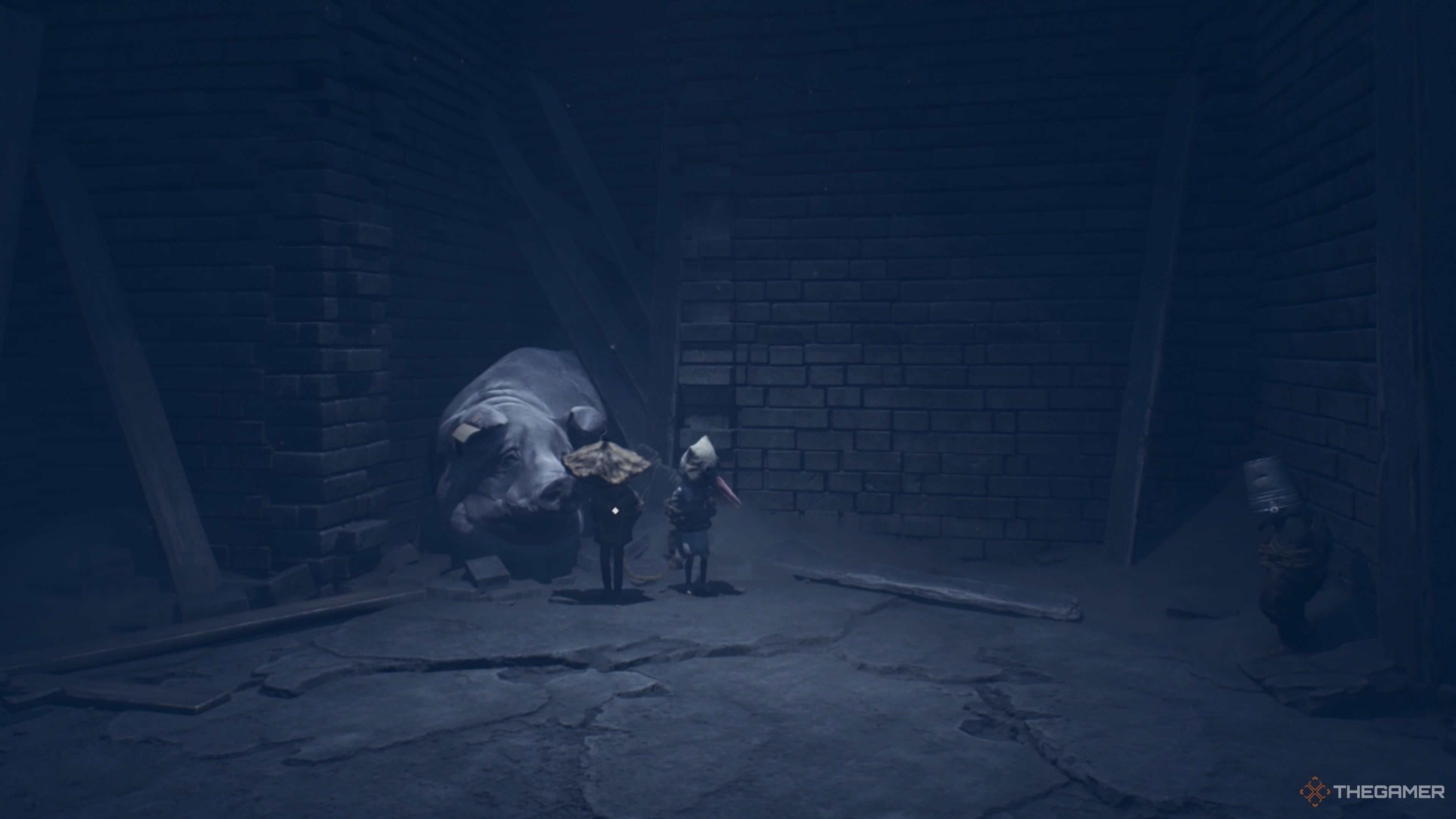 When you find your friend with the bucket on his head in Chapter Four, No Shelter, at the end of the bell tower, you will see a pig running by. Follow it to find the right path, but stop by and interact with it to give it some comfort while it's so scared.