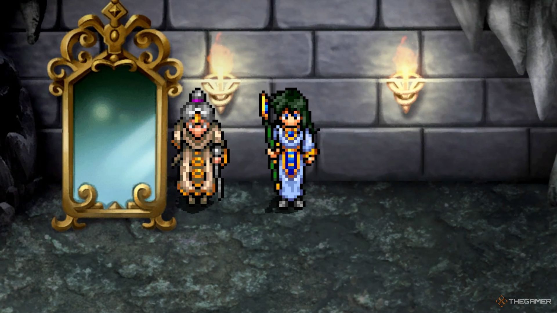 You can simply recruit her by asking her to join. When she leaves to your castle you can open both chests. The chest to the left holds medicine, while The chest to the right contains the flashing mirror. You can use that mirror to return to the castle while you are on the world map whenever you want.