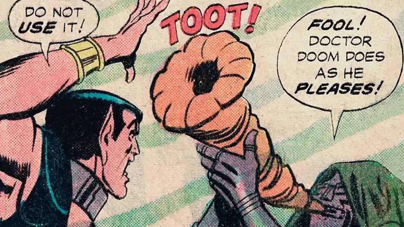 The Horn of Greed card is arguably the funniest, with a Golden Age Doom blowing a horn with the “toot” sound effect, while saying “Fool! Doctor Doom do as he pleases!” to a pleading Namor. Some of the other panel cards include the Fantastic Four against Galactus and the Avengers battling Loki, but none of them are as famous as the Doom toot.