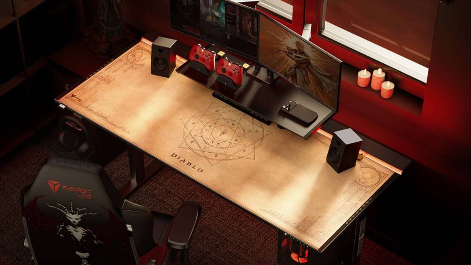 There are hat tips and Easter eggs sprinkled throughout the desk's design. Look closely and you will see the Brotherhood of the Horadrim emblem with. Its matching desk mat is adorned with the sigils of the Seven Lords of the Burning Hells, and its cable management kit comes with Diablo's ritual circle symbol etched into it.