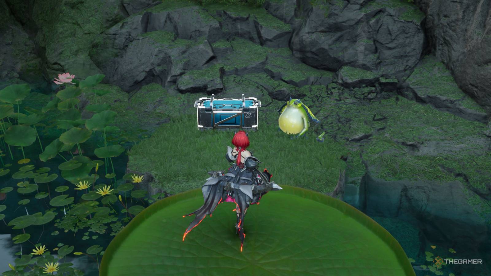 Take the moving leaves in the water east of the chest above and you can solve a frog puzzle to get this chest.